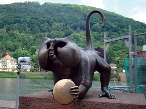 As we started walking towards the historic Old Bridge which was originally constructed in 1284 and later replaced by a wooden bridge in 1788, we noticed a Bridge Monkey or Bruckenaffe on the south bank of the bridge. This carved monkey from medieval times was made of bronze by sculptor Gernot Rumpf and was installed here in 1979 and carries a mirror and a small inscription in German which translates as “Why are you looking at me? Look in the mirror and you will see more of the same.” Today, however, many tourists do a photo stop here and touch the mirror held by the monkey as it is believed to bring you luck. The bridge monkey in Heidelberg dates back to the 15th Century.