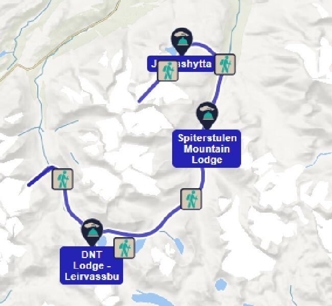 Accommodations: At Spiterstulen and Juvasshytta, you will get a private bathroom with toilet and shower. At Leirvassbu DNT-lodge, you will meet a traditional atmosphere where the rooms have bunk beds and sanitary are in the hall. Leirvassbu has some few rooms with private bathroom on request. See add-ons prices for more information.