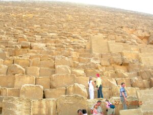 As these interesting facts were being narrated to us, we arrived at the first Pyramid which belonged to King Cheops. This Pyramid comprises of 2300000 (two million three thousand) stones which were counted by soldiers of Napolean. Each stone at the foundation or base weighs between 8 and 10 tons- no wonder the Pyramid is one of the wonders of the world! As the pyramid rises, each stone weighs from 2 to 3 tons. The Pyramid of Cheops is supposed to have four entrances out of which two entrances have been discovered. Excavators have still not figured out where the remaining two entrances to the pyramid are. This Pyramid is amazing as it is the only pyramid which is constructed in such a way that in order to descend into it, you have to ascend first – it is hollow from the inside. When you go inside the pyramids, you will find three chambers and the third chamber is where the remains of the King were found. From within the pyramid, there is a passage which takes you 30 metres below ground level where the cartouche of the King was found.