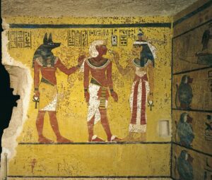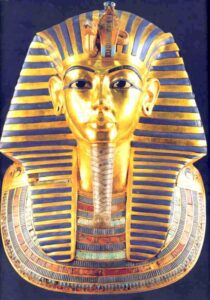 The most outstanding of the Tutankhamun treasures is the Gold Mask made of semi-precious stones and coloured glass. This magnificent mask was fitted directly on the face and shoulders of the mummy in the innermost coffin. Another striking masterpiece is the coffin containing Tutankhamun’s internal organs. The internal organs of the pharaoh were laid in 4 coffins each accommodating one of the internal organs i.e. the lungs, the liver, the stomach and the intestines which were removed from his body during mummification. One of the most popular statues of which the replica is also found in souvenir shops, is the ‘Ka Statue of Tutankamun’. This statue was found on both sides of the entrance to the burial chamber as if to guard it. It is made of wood and bitumen.
